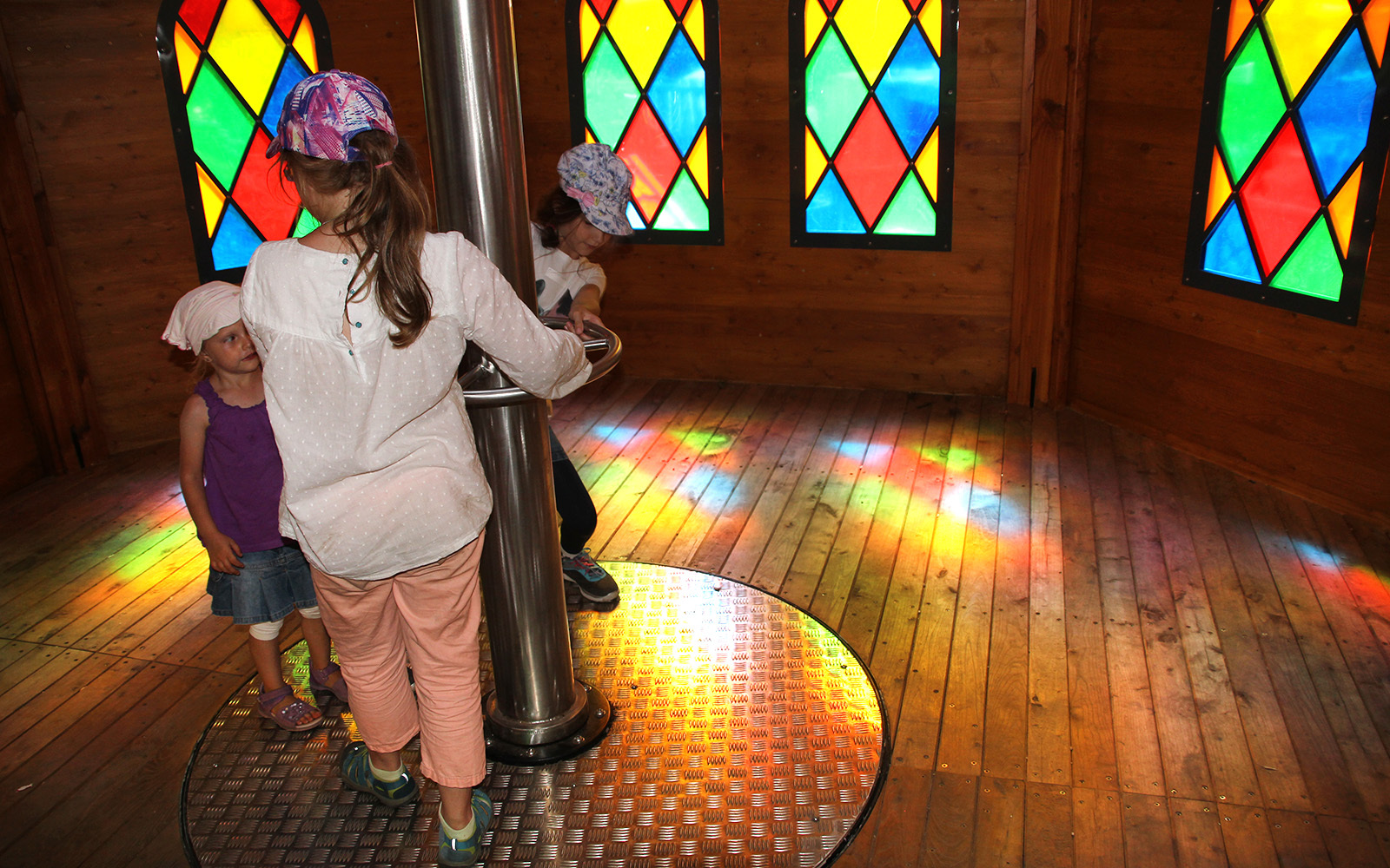 Wer möchte da nicht mehr erfahren? Antworten auf diese Fragen erhalten natürlich nur die wahren Entdecker. Die, die sich ins Abenteuer stürzen, den geheimnisvollen Spuren folgen und herausfinden, zu welchem Tier sie führen. Und um das alles zu ergründen „muss“ geklettert, gekrabbelt und erkundet werden. Im „Haus der Richtungen“ im Freizeitpark Schloss Beck in Bottrop können Kinder nicht nur spielerisch lernen, sondern auch über viele unerwartete Überraschungen staunen. So gibt es beispielsweise hoch oben im Turm ein Kaleidoskop mit Klangspiel, dass durch einen drehbaren Boden immer wieder neue Form- und Farbspiele hervorruft.