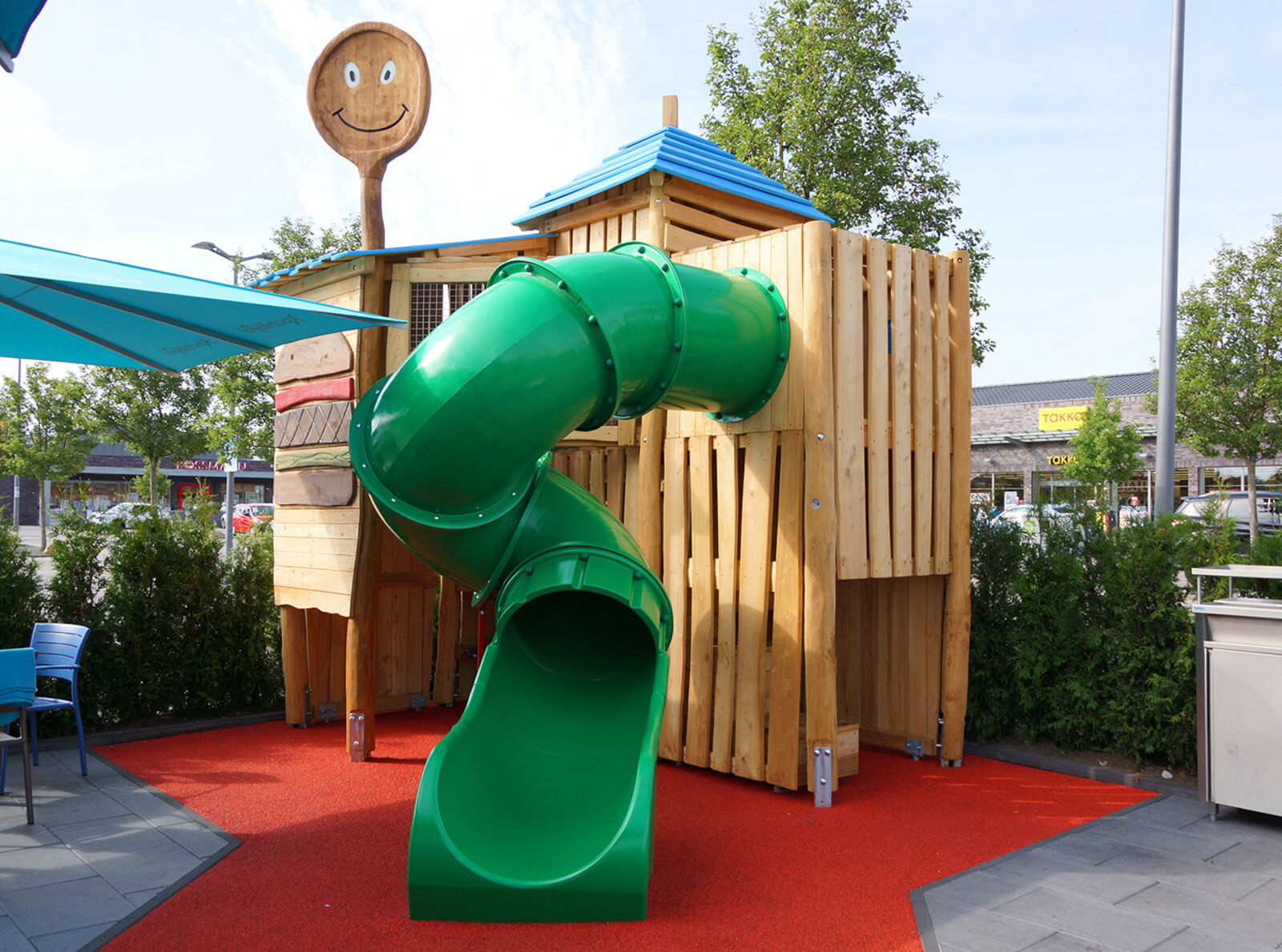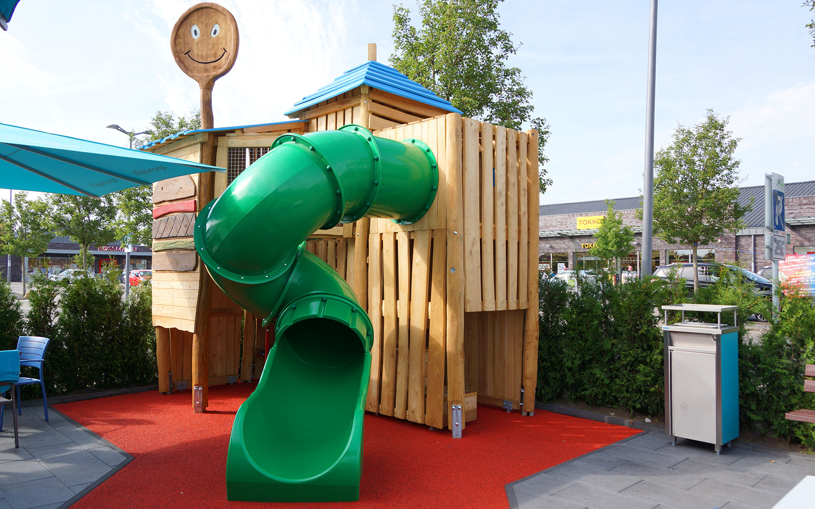 Den kleinen und großen Besuchern der Kochlöffel-Filiale werden der große, lächelnde Löffel, das Topelement der Robinienanlage, und der große Burger an der Spielstation direkt ins Auge fallen.