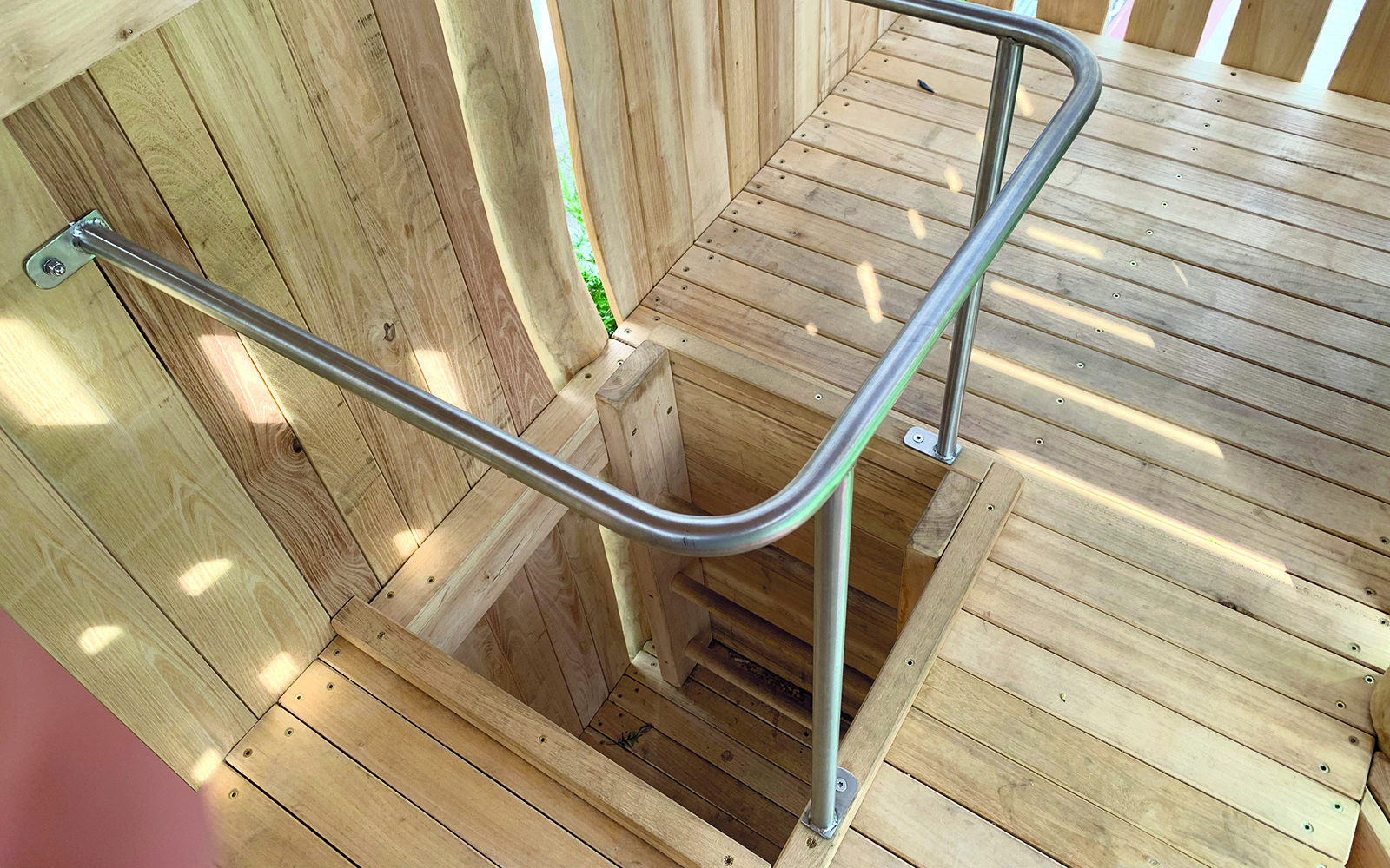 Über kleine Kletternetze, eine Rutschstange oder über die Stufen der Spielanlage gelangen die Besucher zum oberen Teil der Anlage, der mit bunten Fenstern ausgestattet ist. Die Kinder sausen über die Rutsche hinunter und landen auf dem farbigen Fallschutz, um die Anlage gleich ein weiteres Mal hinaufzuklettern, während ihre Eltern ihnen beim Spielen zuschauen können.
